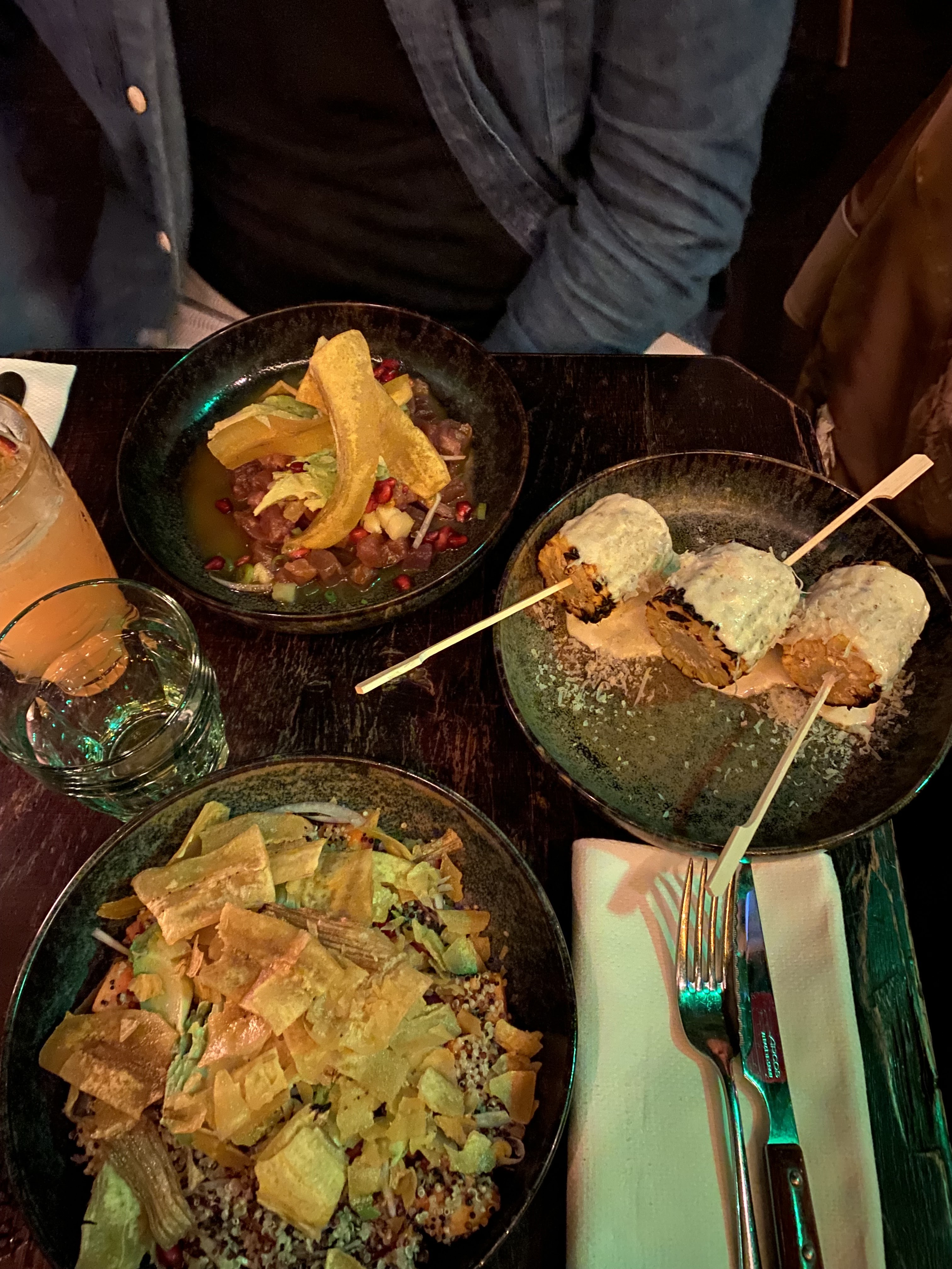 Le personnel est au petits soins très gentils et serviable, le cadre est joli, de la musique latino (reggeaton salsa etc..) en fond sonore et on s’entend parler. Les cocktails sont bons et bien dosés, les entrées (maïs,aubergine, guacamole) sont très bonnes ce que j’ai pris car pas beaucoup de choix vegé et j’ai été rassasiée et le dessert cheesecake fruit passion délicieux !